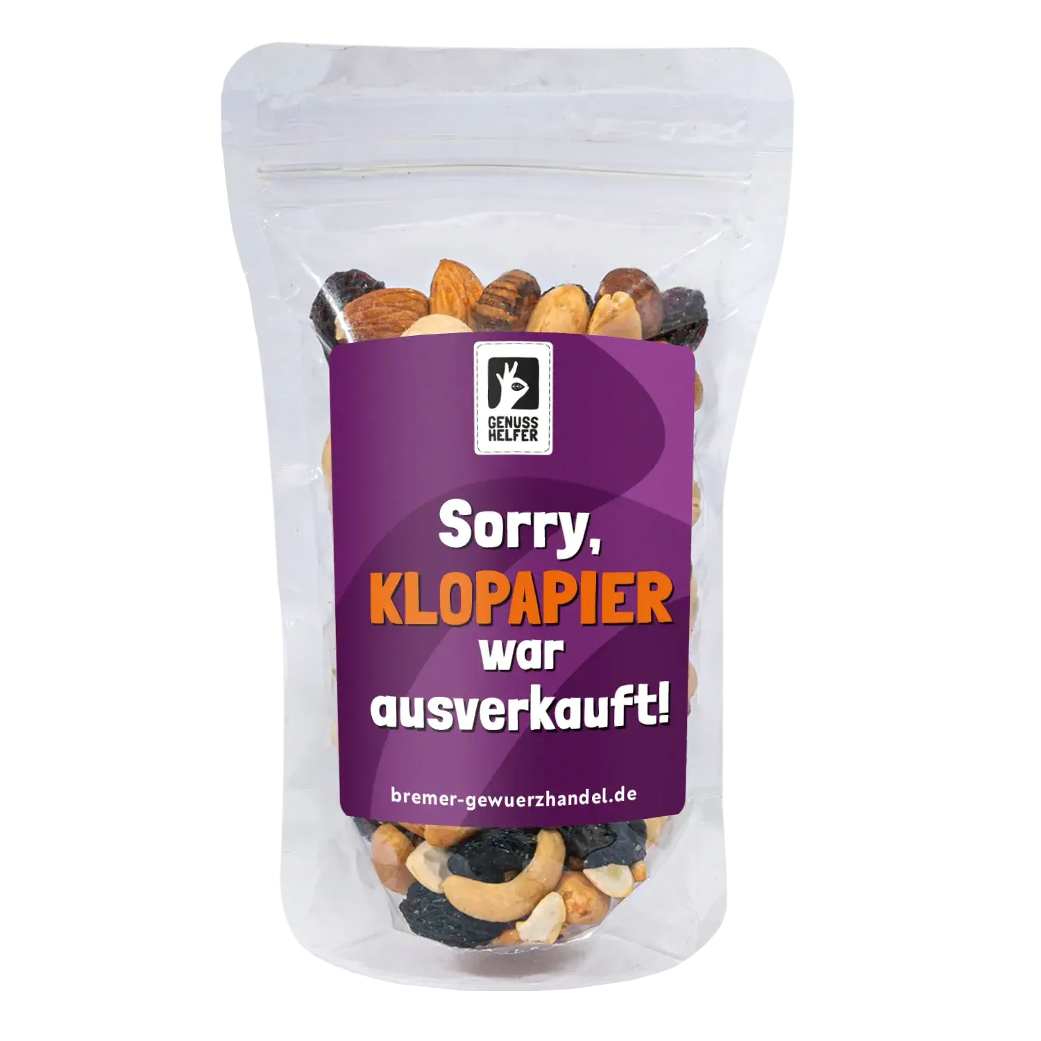 Verschenken Sie unsere GeNUSSmischung mit dem frechen Spruch "Sorry, Klopapier war ausverkauft" und zaubern Sie jemandem garantiert ein Lächeln ins Gesicht. Diese humorvolle Nuss-Frucht-Mischung ist das perfekte Geschenk, wenn es mal etwas Außergewöhnliches sein soll.